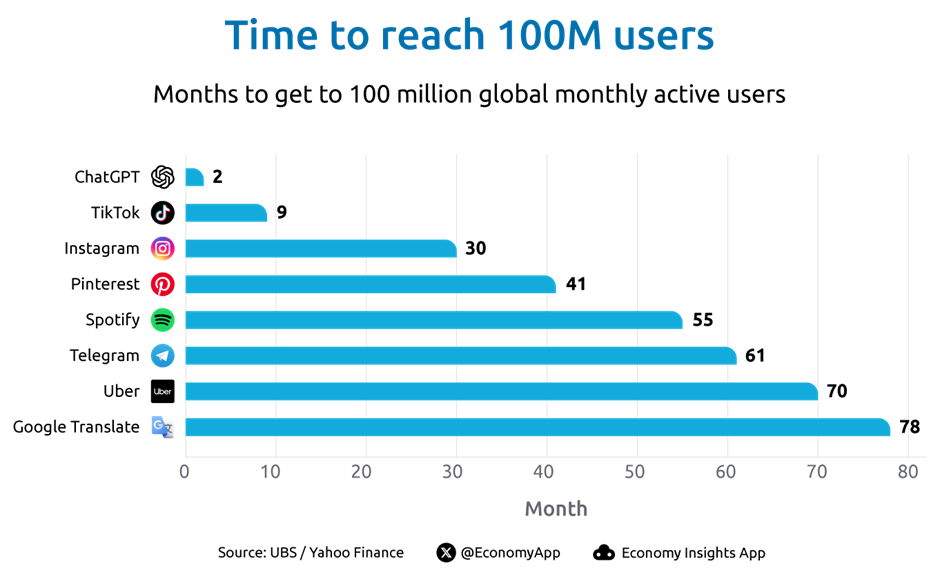 However, this pales in comparison to Chat GPT, with a staggering 2 months to go from 0 to 100 million users.